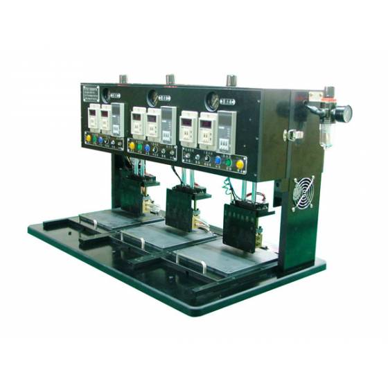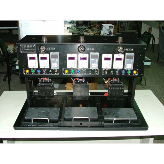 說明:依產品特性設計專屬的熱壓機,可使用溫控裝置設定溫定,計時器設定欲加壓秒數,另一計時器設定散熱秒數,將產品送入後壓下啟動開關即可進行熱壓,加壓時間到後會進行散熱後熱壓頭方會離開加工產品。