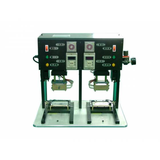說明:依產品特性設計專屬的熱壓機,可使用溫控裝置設定溫定,計時器設定欲加壓的秒數後,將產品送入後壓下啟動開關即可進行熱壓,下方模具可進行X軸方向微調。