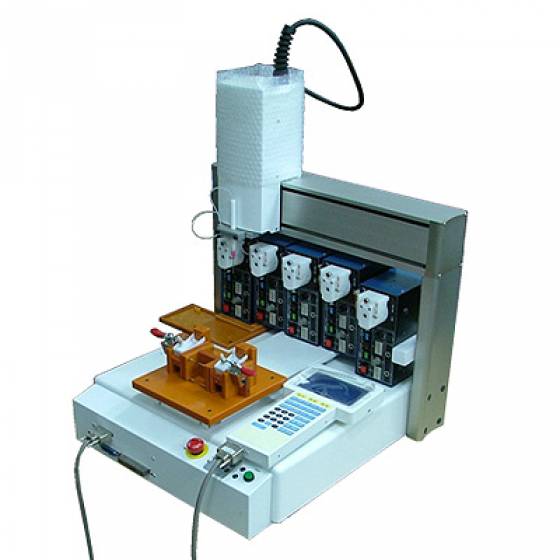 說明:依產品特性設計專屬的點膠治具,軸進方位可達XYZ 3軸僅需將產品置入置料槽即可輕鬆完成點膠工作。